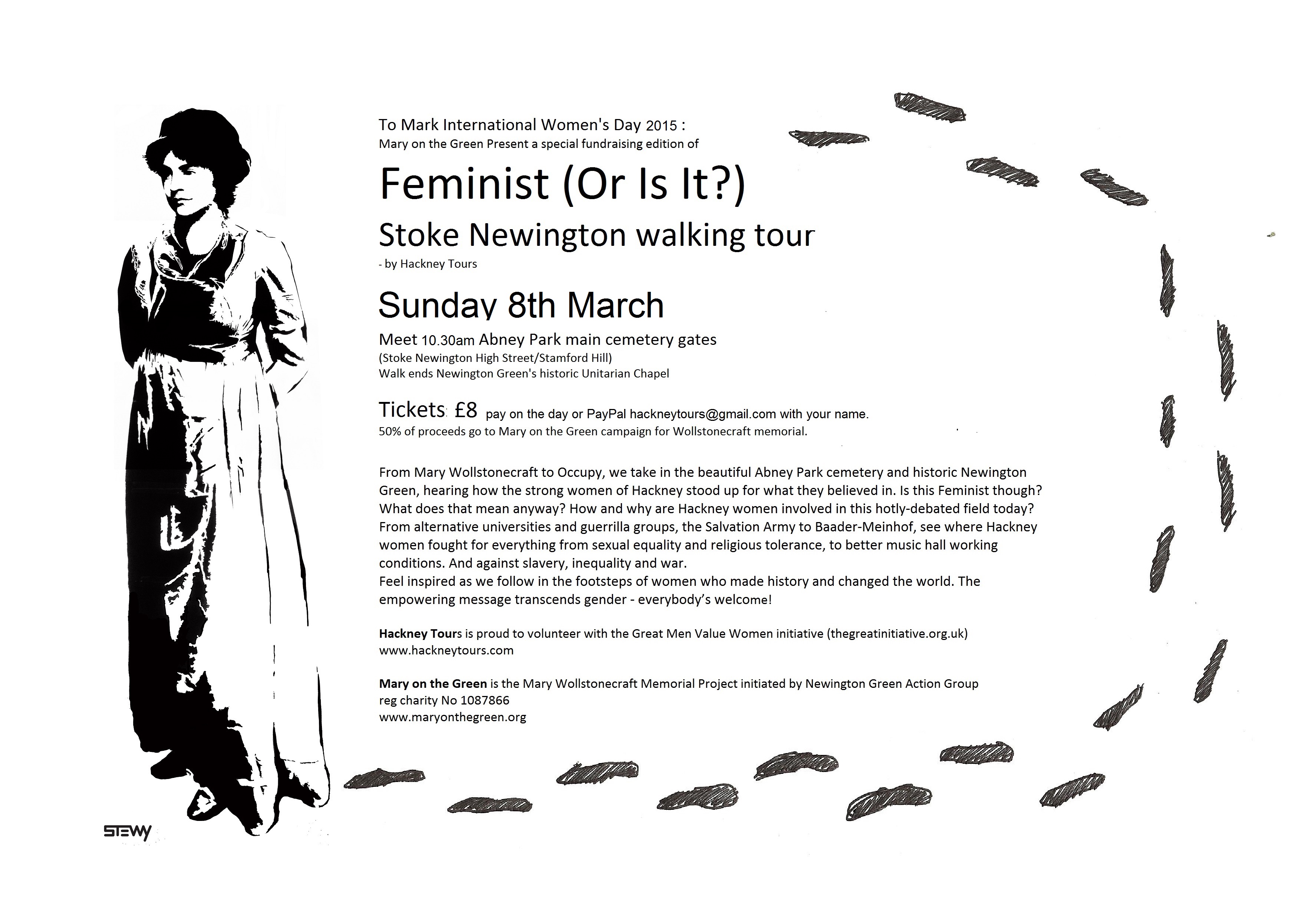 Special fundraising edition of the ‘Feminist (Or Is It?) Stoke Newington‘ guided walk (see here for usual walk): Sun 8th March; meet 10.30am main gates of Abney Park cemetery N16; cost £8 with 50% of proceeds to fund for Mary Wollstonecraft statue in Newington Green (see here); just turn up. Features the stunning Abney Park cemetery (Hackney Tours video here) and the campaign for more recognition for Mary Wollstonecraft. Come and get involved!