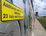 Always helicopters: in the weeks leading up to the opening ceremony their constant drone was the soundtrack to this project. To the chagrin of many, the towpath cycle/walking route in front of the fence was closed at short notice and became No-Man’s Land patrolled by soldiers and private security guards; a ‘sterile’ strip before any intruders could even get to the high electric fence.